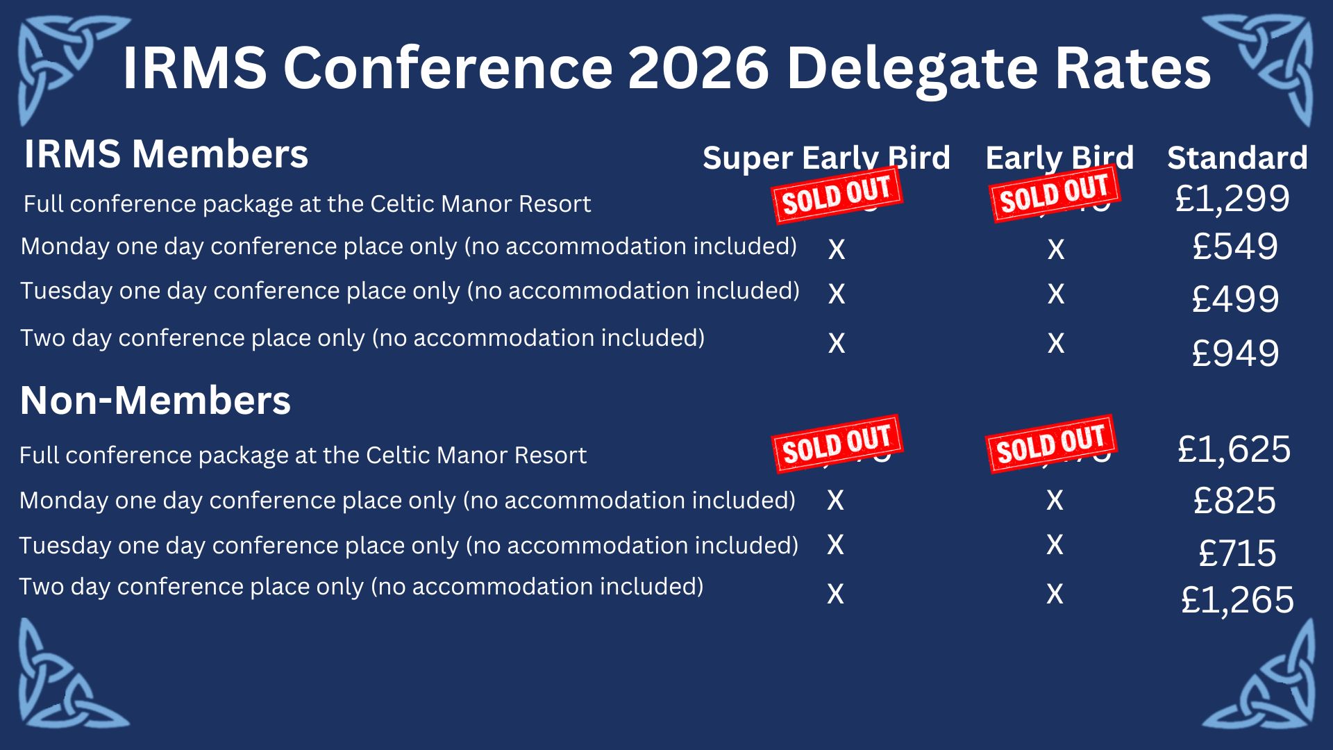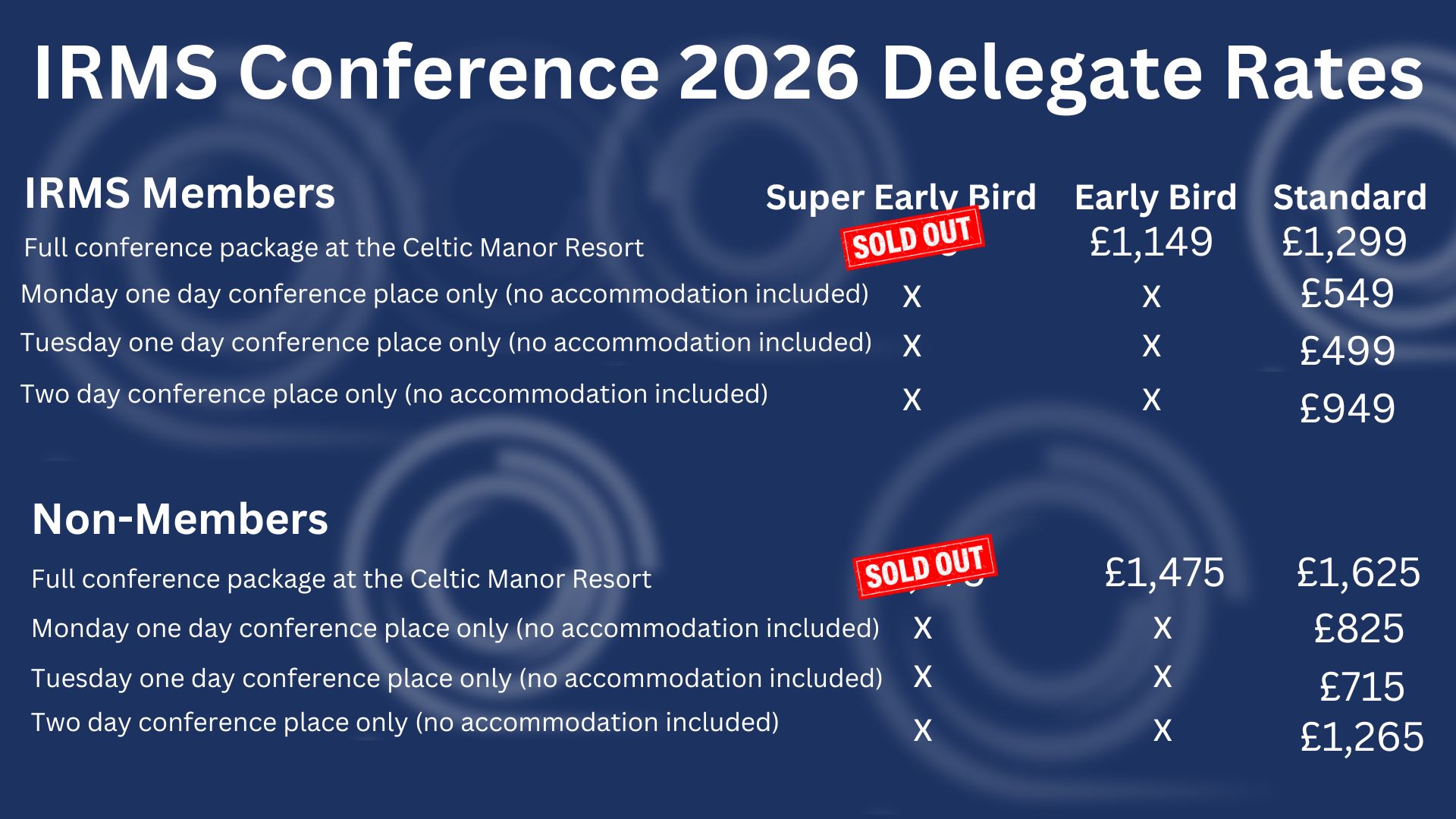 Conference prices can be viewed here. If you have any queries, please contact us at irms@revolution-events.com or call 01892 820942.